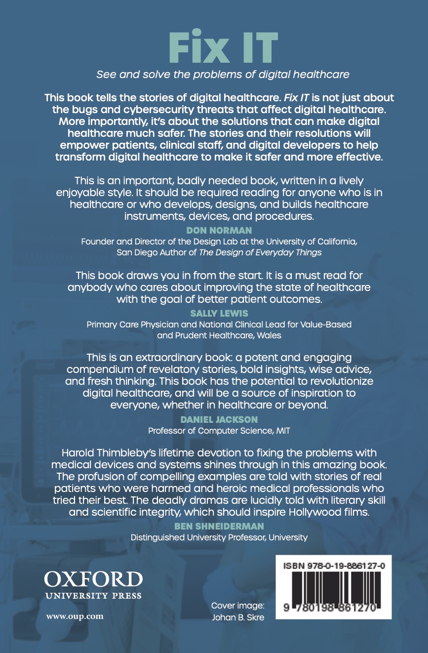 The prize is inspired by Prof Thimbleby’s book, Fix IT: See and solve the problems of digital healthcare (Oxford University Press, 2021), which was published in November 2021. The book is described briefly below.